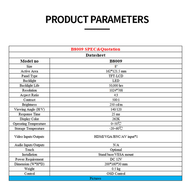 - Video Inputs/Outputs: VGA+AV+BNC+HDMI