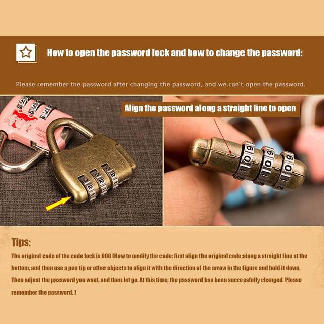 알림: 암호 잠금의 원래 암호는 000 입니다. (암호 수정 방법: 먼저 최종 줄을 따라 원래 암호를 정렬 한 다음 펜 끝 또는 기타 개체를 사용하여 그림의 화살표 방향을 정렬하고 길게 누릅니다. 원하는 암호로 조정 한 다음 놓아 둡니다. 현재 암호가 성공적으로 변경되었습니다. 암호를 기억하십시오).